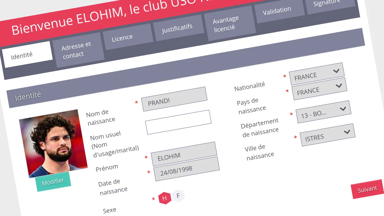 Complétez les informations d’identité avec soin (elles sont définitives), et indiquez vos informations de contact (adresse, numéros de téléphone mobile), elles sont nécessaires au club pour assurer l’organisation. Ajoutez une photo d’identité récente, bien cadrée, sur fond neutre.